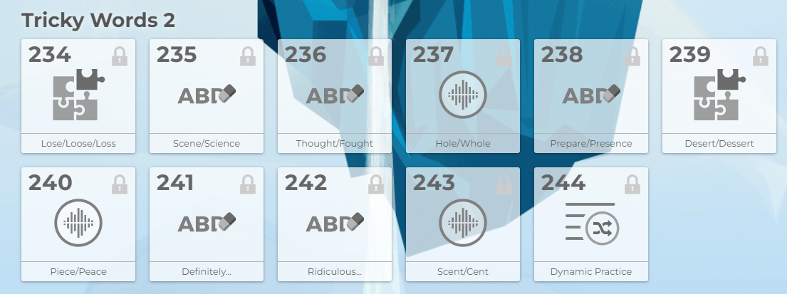 비슷하게 생긴 단어들을 반복 연습하는 Tricky words 단계도 있고,