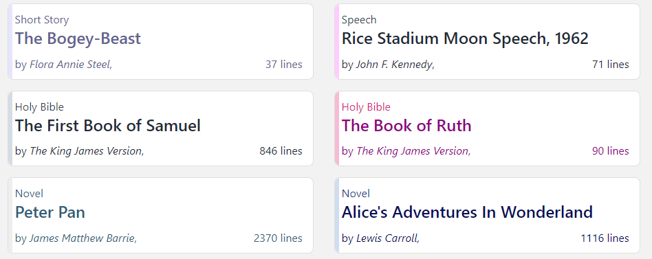 성경, 소설, TED 연설뿐만 아니라 유명인들의 스피치 등 다양한 영문으로 영타 연습을 할 수 있습니다.
